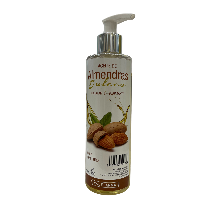 El aceite de almendras dulce, extraído por presión de la semilla, se ha utilizado desde hace milenios para mejorar la apariencia y el estado general de la piel, especialmente en casos de sequedad, deshidratación o escamación. Debida a su variada composición el Aceite de Almendras Dulces, es ideal para tratar un gran número de trastornos cutáneos tales como la deshidratación, las irritaciones y los picores. Mantiene la piel joven y sana. El Aceite de Almendras Dulces, es recomendable durante el embarazo, ya que da elasticidad a la piel y así previene la aparición de estrías. Proporciona elasticidad a la piel, dejándola hidratada, nutrida y suave. Es muy utilizado en el tratamiento de masajes por sus propiedades emolientes y antiinflamatorias, y por su capacidad para suavizar la piel. Lubrica y protege la piel desgastada o escamosa, y es muy adecuado para problemas de irritación y alergia ya que produce efectos calmantes. Previene y repara estrías y arrugas, y es óptimo para aplicar en pieles muy sensibles como la de los bebés. Hidrata y nutre la piel en profundidad, retrasa la aparición de arrugas, así como previene la formación de estrías. Contiene proteínas, minerales, vitaminas A y B y azúcares, así como Triglicéridos, que favorecen la renovación de la fase grasa del manto hidrolipídico de la piel. El Aceite de Almendras Dulces se puede utilizar para los cabellos dañados y sin brillo, también se pueden beneficiar con el aceite de almendras dulces. Extender dos cucharadas de aceite de Almendras Dulces uniformemente sobre todo el cabello y mantener cubierto con una toalla. Dejar actuar durante unas horas y aclarar abundantemente. Después lavar el cabello con el champú habitual.