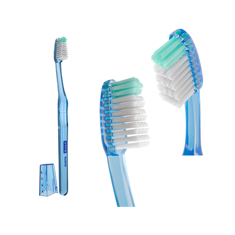 El cepillo de uso diario marca VITIS con cabezal normal en forma diamantada para llegar a las zonas de difícil acceso de la cavidad bucal.