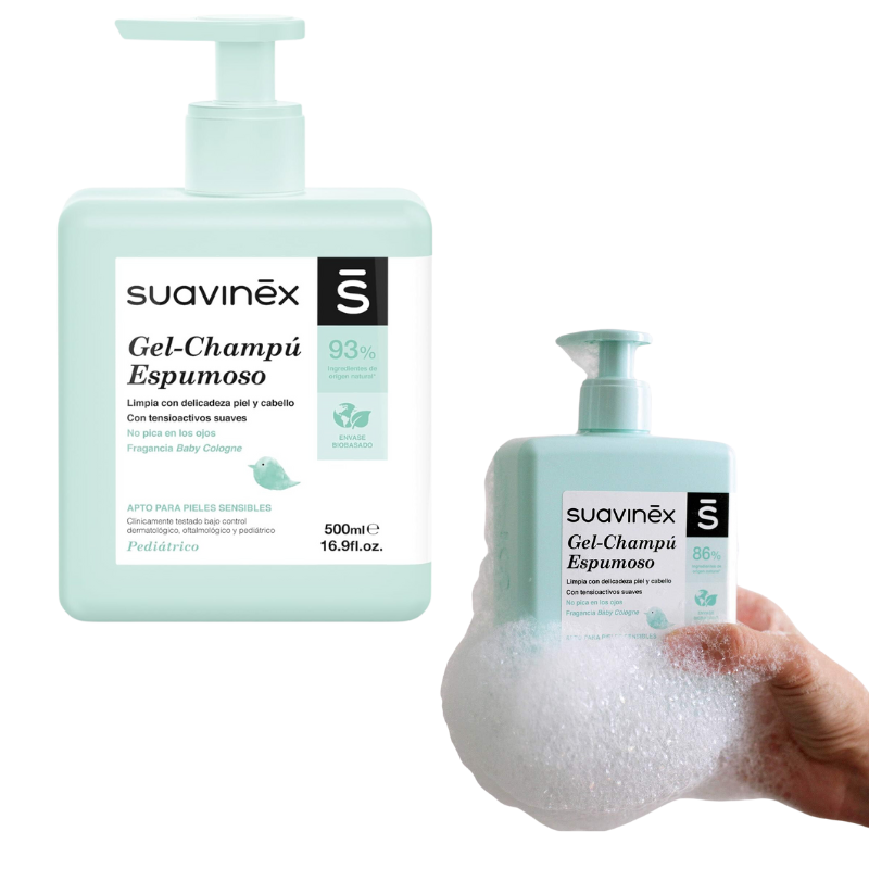 Gel-champú Espumoso Suavinex, limpia la piel y el cabello del bebé y no pica en los ojos. Con su textura espumosa y la fragancia Baby Cologne para una experiencia sensorial más agradable. Tiene un formato 500ml y el 86% de sus ingredientes son de origen natural.