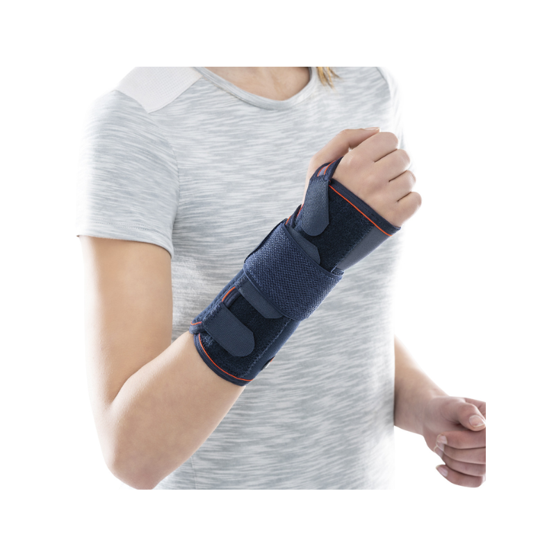 Muñequera en neopreno de 4.5 mm con pletina de aluminio con apoyo semiesférico palmar, extraible y moldeable, y cierres velcro.