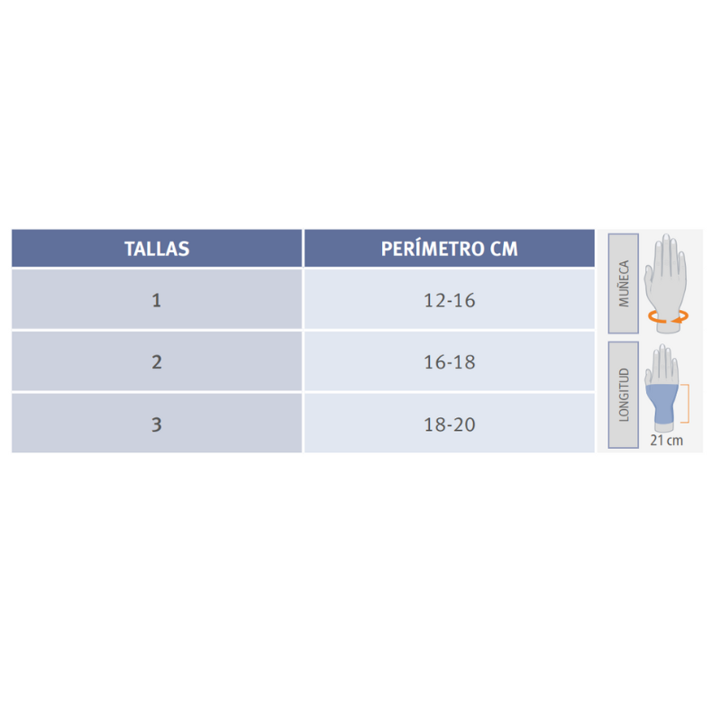 Muñequera confeccionada con una base textil transpirable y una capa de algodón que está en contacto con la piel permitiendo el libre movimiento de los dedos. Las férulas palmar y de pulgar son de aluminio maleable y disponen de dos refuerzos dorsales de plástico, facilitando una adecuada sujeción de la muñeca y pulgar según los ángulos deseados.